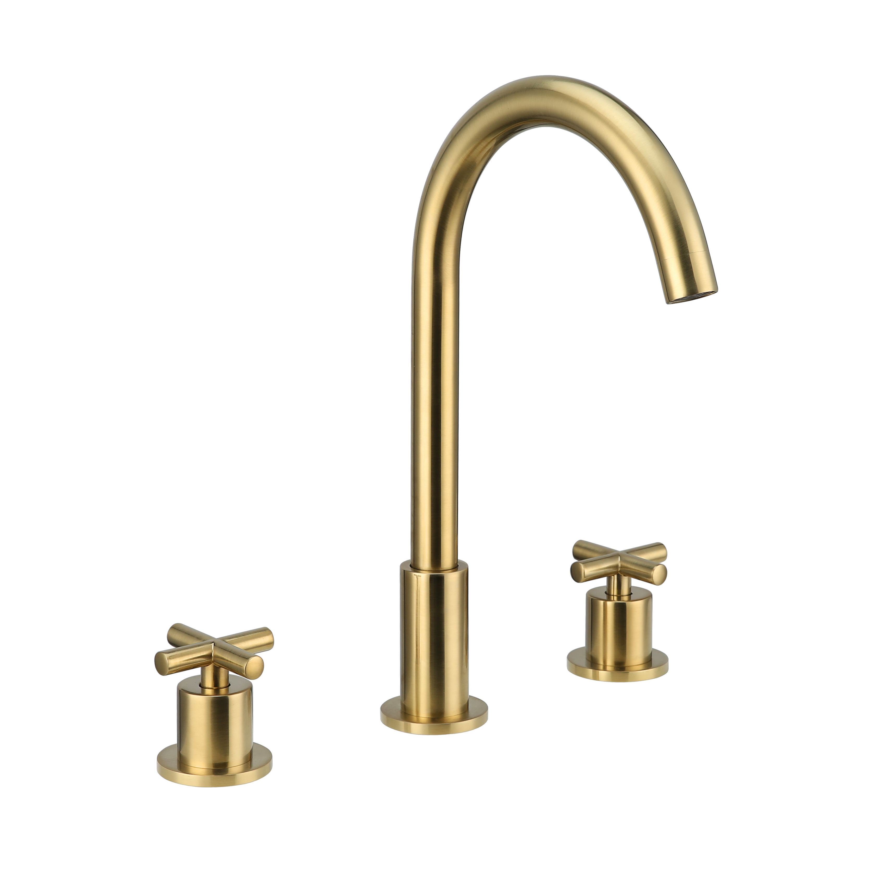 Central to its design is a sense of proportion and harmony. The tall, arched spout rises elegantly from the surface, offering generous clearance for everyday use while maintaining a well-balanced silhouette. Its cylindrical base and streamlined profile emphasize a modern attitude, while the cross-shaped handles introduce a touch of vintage charm. The result is a versatile fixture that adapts easily to a wide range of bathroom styles, from sleek minimalism to transitional sophistication.