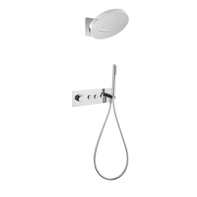 Included Components: Rainfall showerhead, hand shower, thermostatic mixer valve, ceiling arm, hose, and mounting hardware.