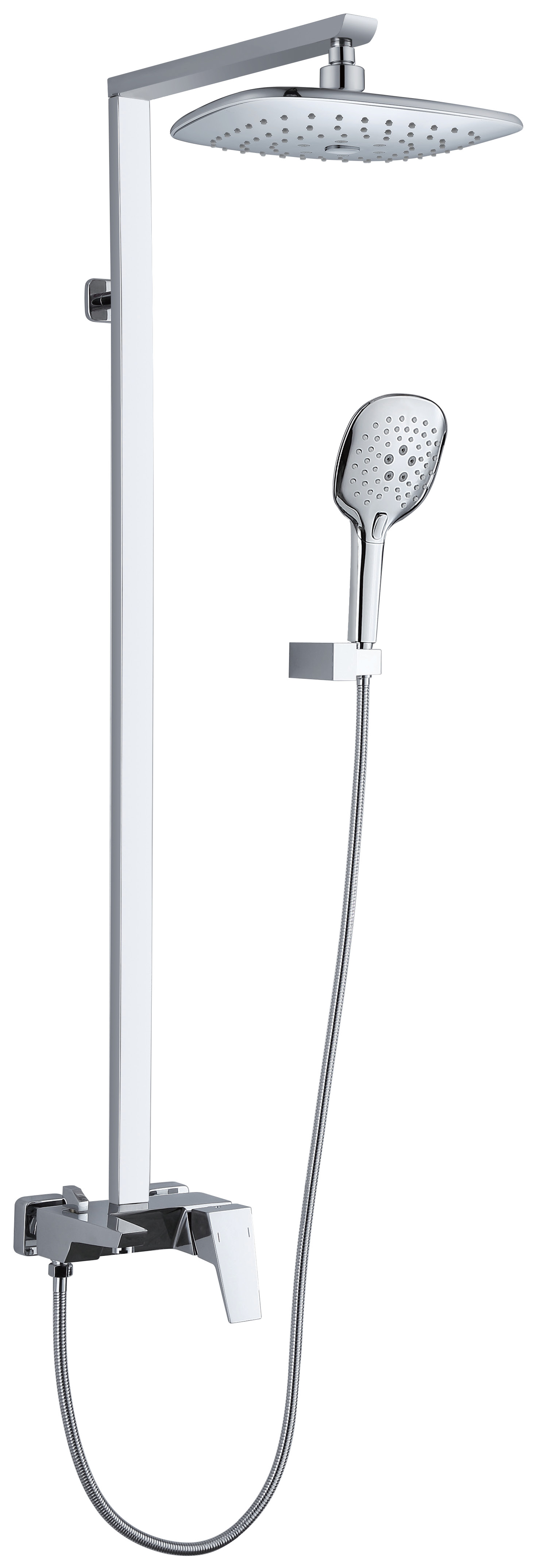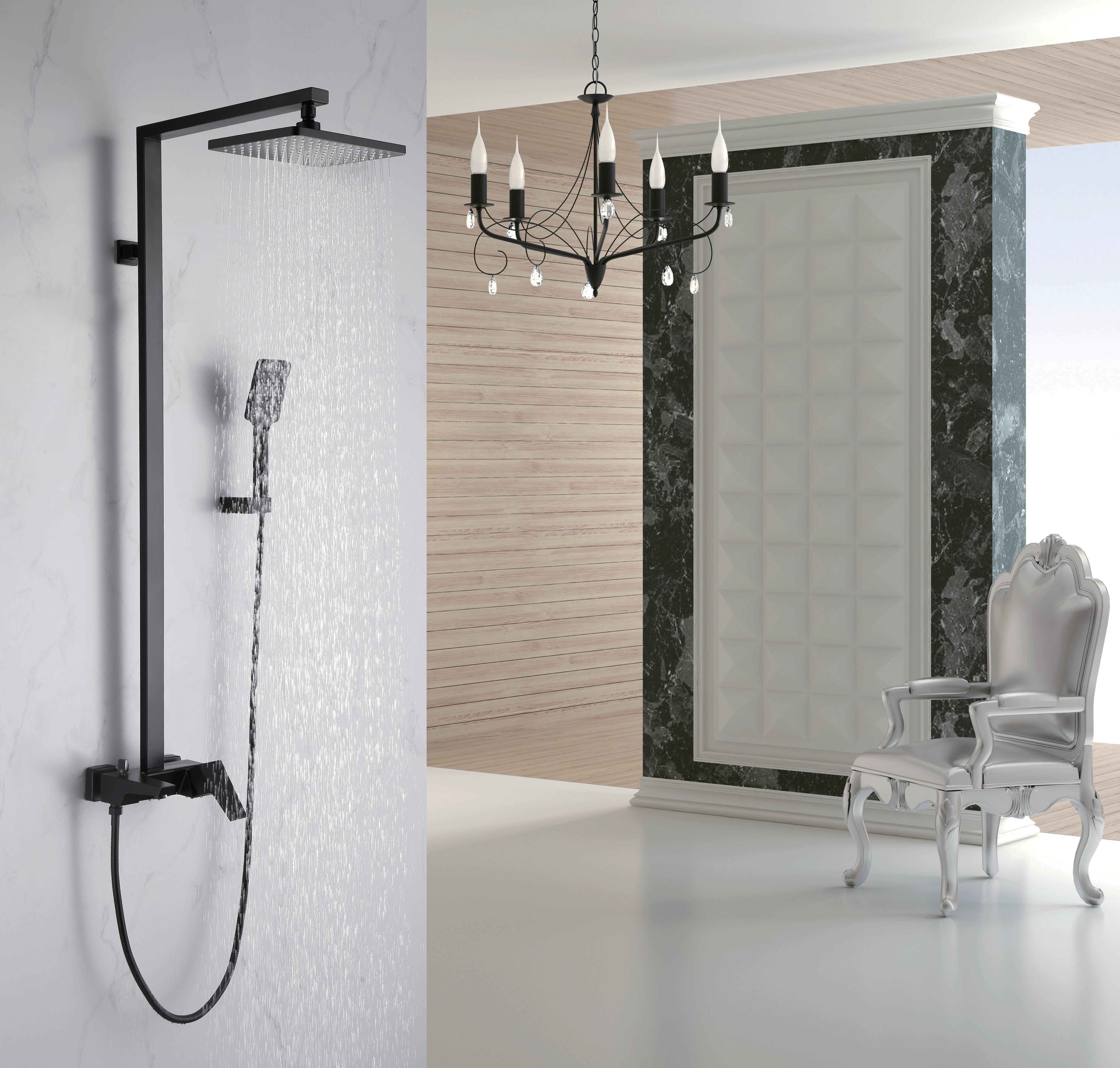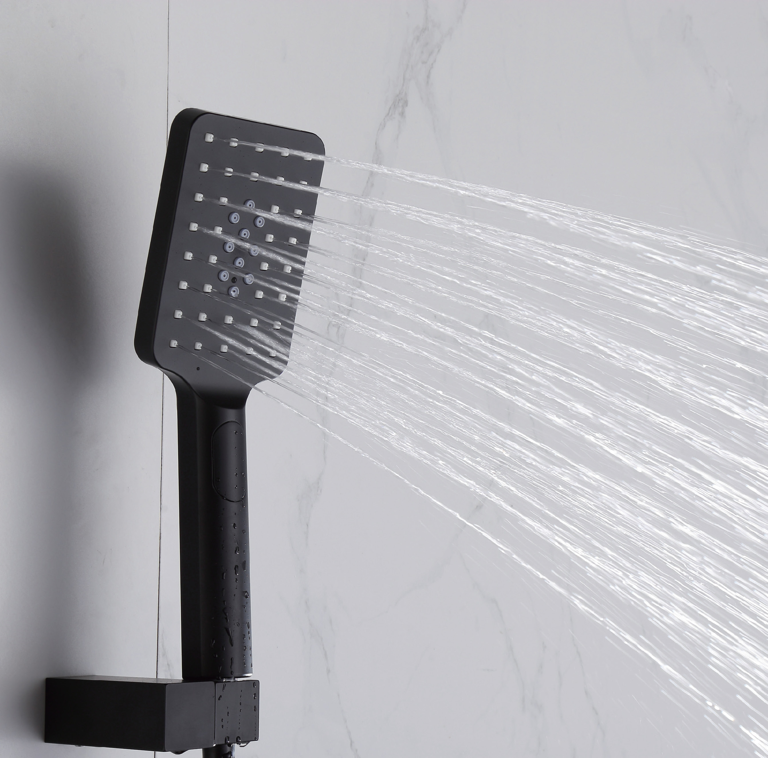 The system includes a generously sized square overhead rain shower that delivers an immersive rainfall experience, enveloping your body in a soothing cascade of water for ultimate relaxation. Complementing this is an ergonomically designed handheld shower, offering exceptional flexibility for focused rinsing, effortless cleaning, and convenience during everyday use. Both components are crafted from solid brass and high-quality materials, ensuring exceptional durability, structural integrity, and resistance to daily wear in high-humidity environments.