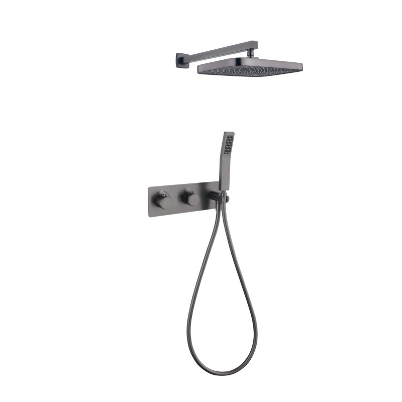 Included Components: Rainfall showerhead, hand shower, thermostatic mixer valve, ceiling arm, hose, and mounting hardware.