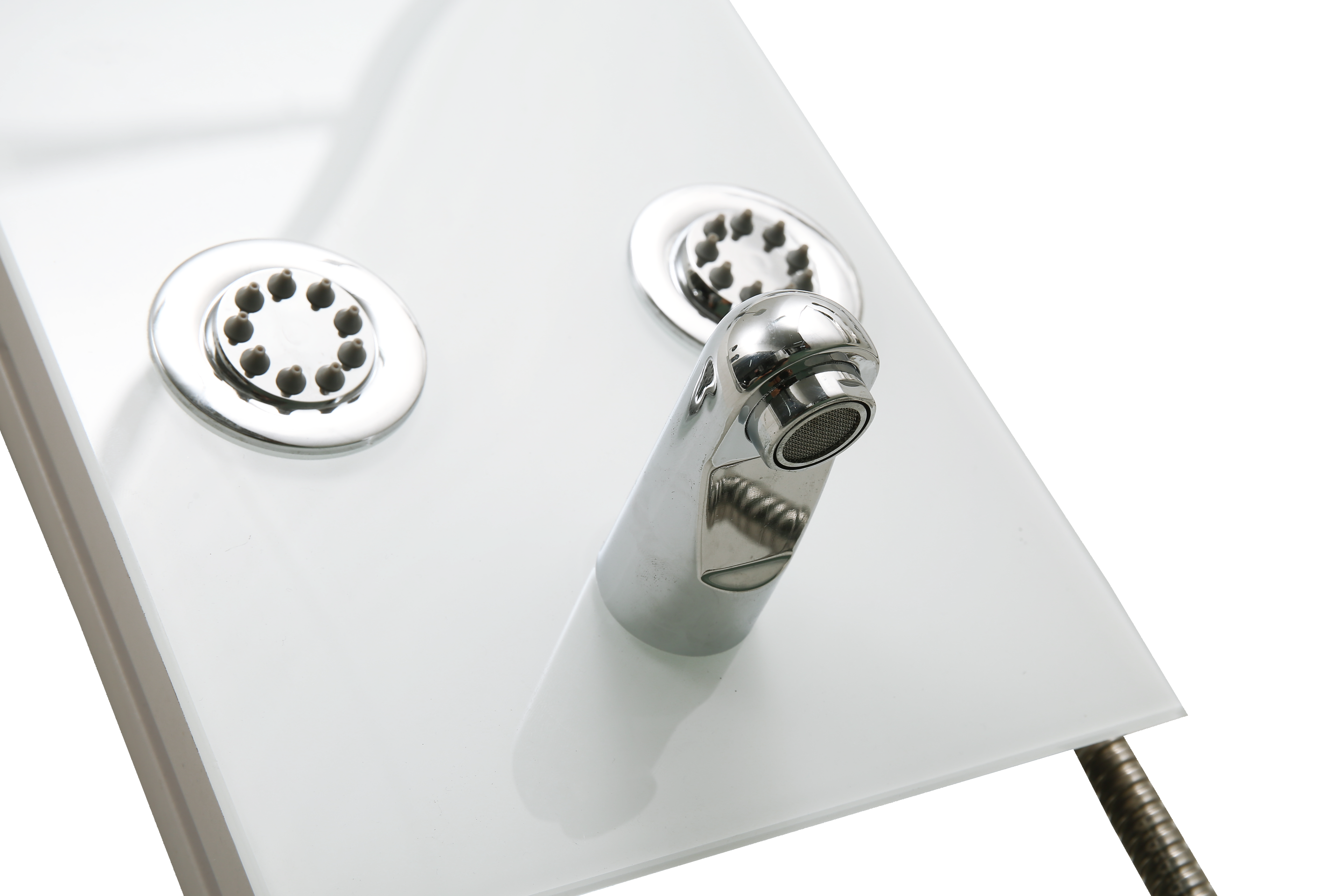Includes rainfall showerhead, handheld shower wand, body jets, and a sleek vertical panel with built-in diverter.