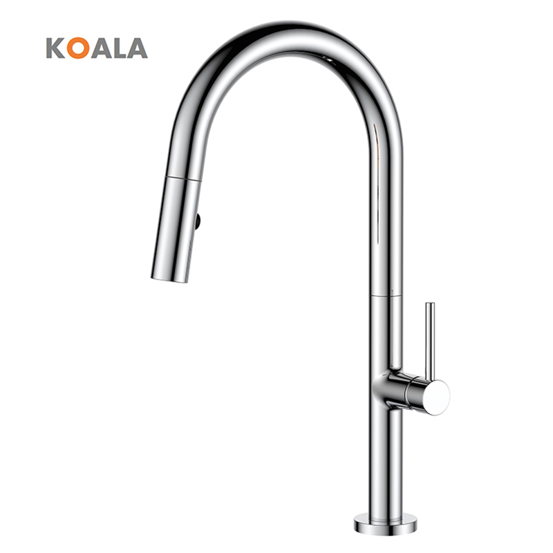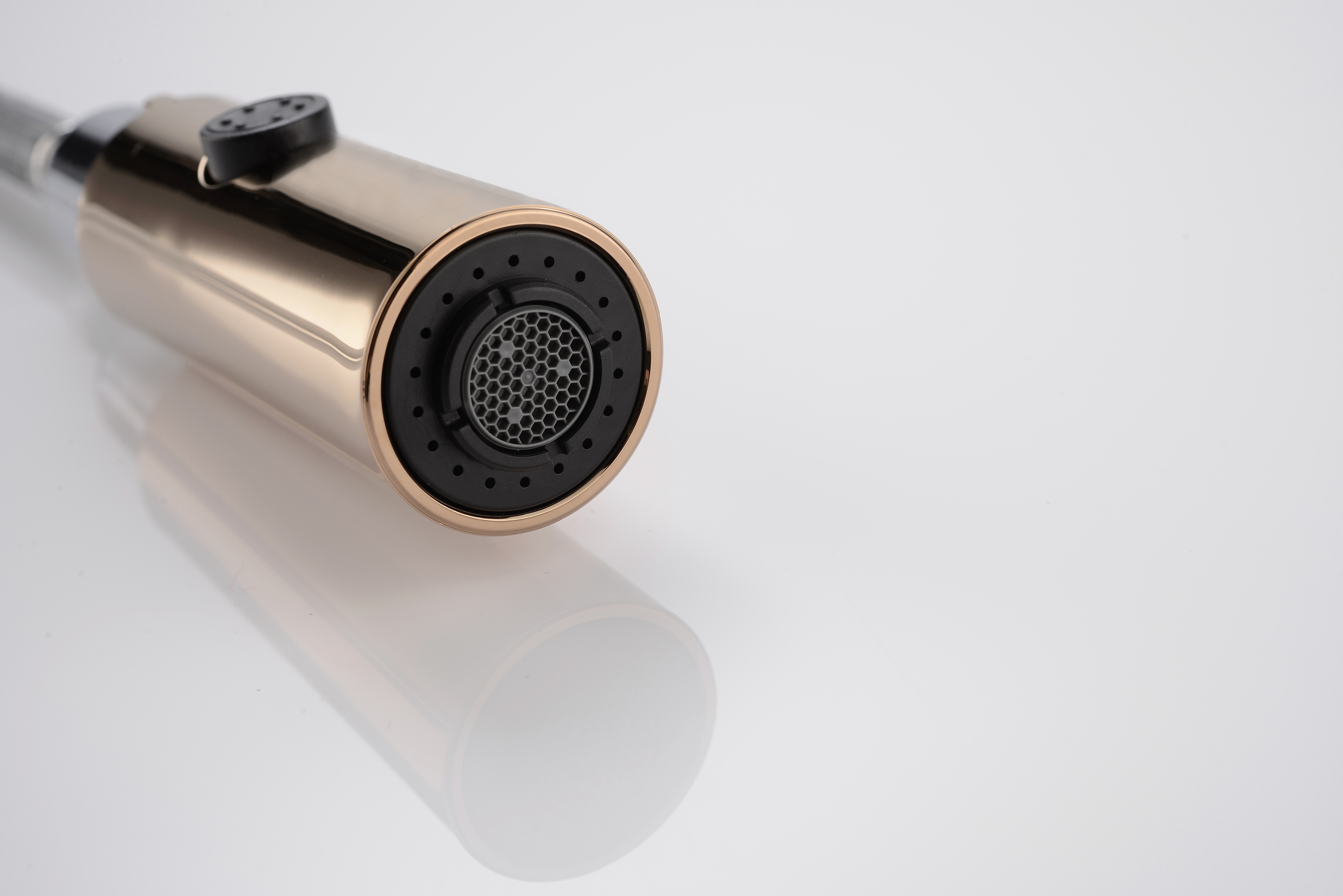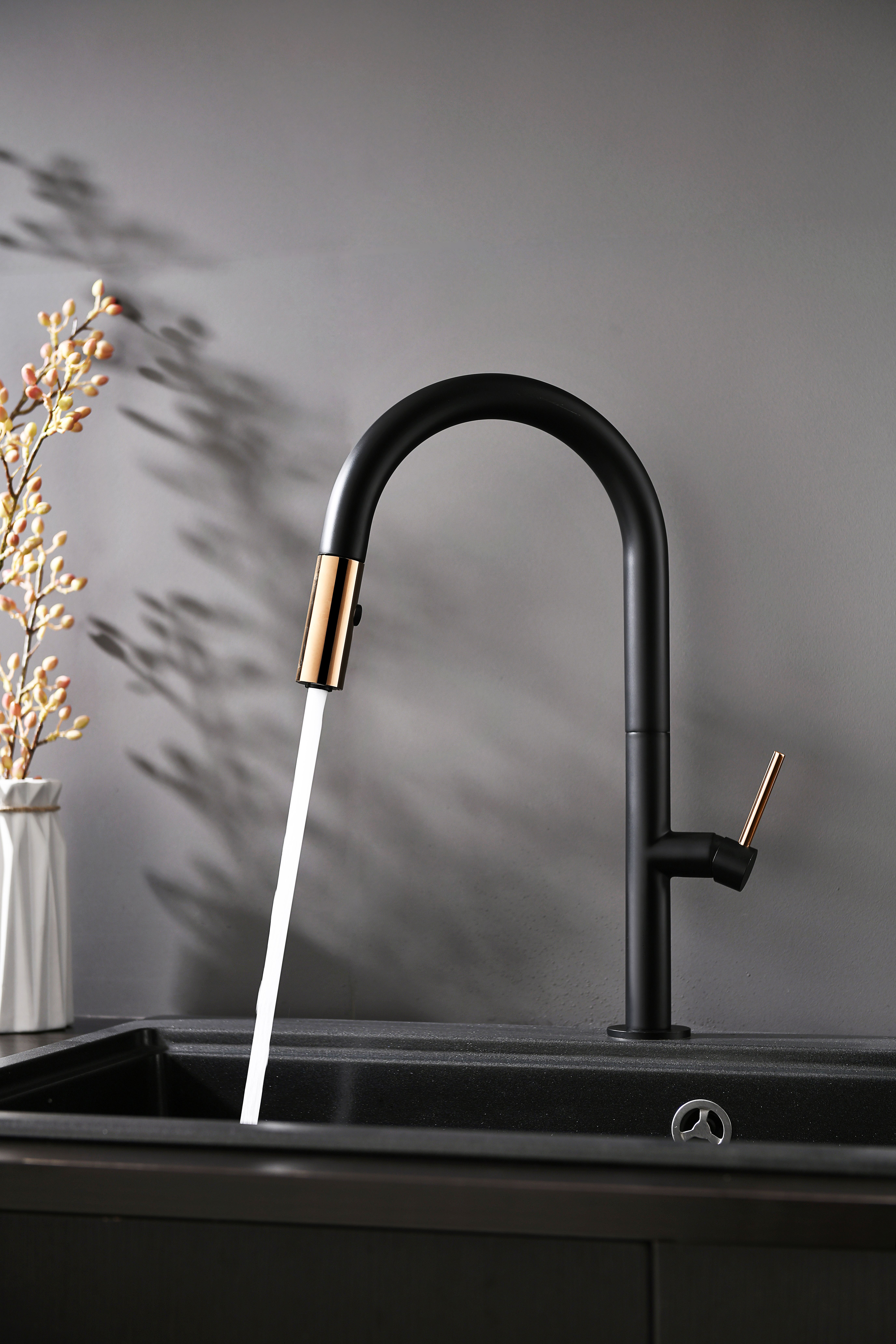 This kitchen faucet combines minimalist design with a touch of luxury, featuring a striking black and rose gold color scheme that instantly elevates your kitchen’s style and showcases refined taste. Crafted from premium-quality brass and finished with multiple layers of plating, it offers exceptional durability, corrosion resistance, and long-lasting brilliance. The innovative pull-out spray design makes cleaning effortless, reaching every corner of the sink and handling even large cookware with ease, while the 360° swivel spout adds maximum flexibility. Two water flow modes allow you to switch seamlessly between a gentle aerated stream for delicate rinsing and a powerful spray for efficient cleaning, meeting a variety of kitchen needs. Equipped with a high-precision ceramic cartridge, this faucet ensures smooth water flow and prevents leaks for years of reliable use. The single-handle design with hot and cold control offers simple, convenient operation for adjusting the perfect temperature. More than just a faucet, it’s a statement piece that combines functionality with modern aesthetics, transforming every moment in the kitchen into a pleasure.