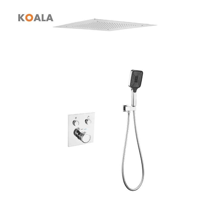 Included Components: Rainfall showerhead, hand shower, thermostatic mixer valve, ceiling arm, hose, and mounting hardware.