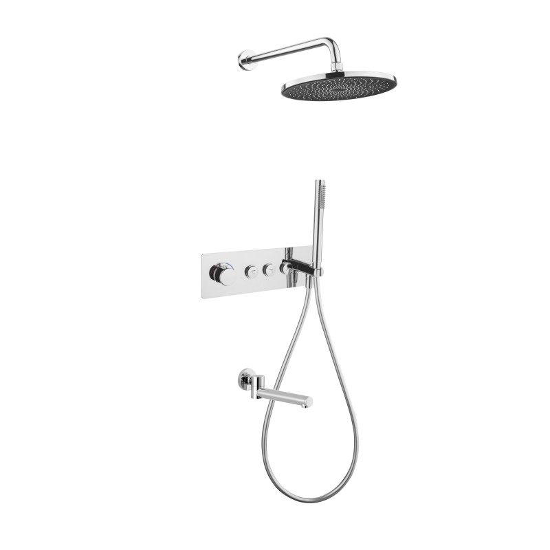 Included Components: Rainfall showerhead, hand shower, thermostatic mixer valve, ceiling arm, hose, and mounting hardware.