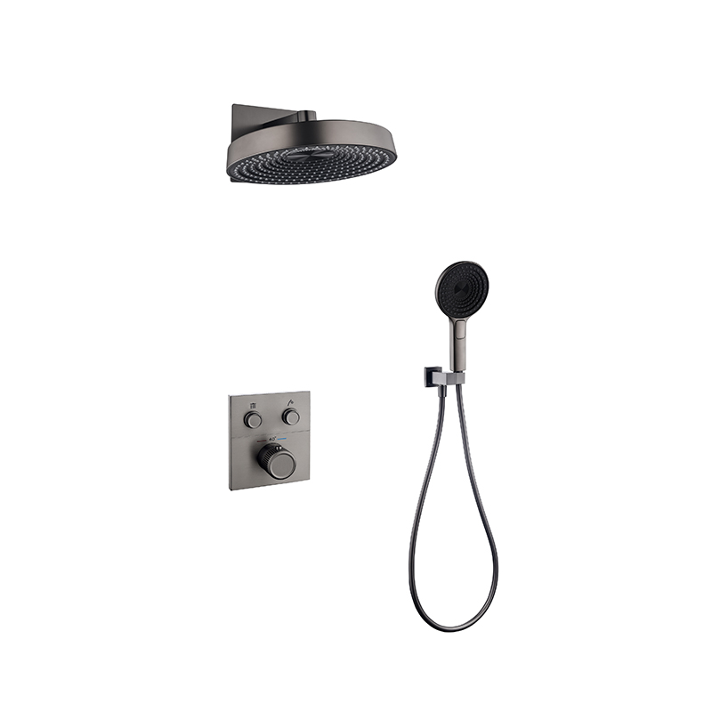 Included Components: Rainfall showerhead, hand shower, thermostatic mixer valve, ceiling arm, hose, and mounting hardware.